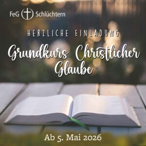 Herzliche Einladung zum Grundkurs christlicher Glaube, der am 5. Mai 2026, um 19.30 Uhr von Pastor Heiko und Brigittes Schmidt angeboten wird. In sechs Abenden
